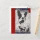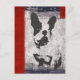 A black and white photo of a boston terrier that has been processed so it has a scratched gray grunge faded retro look. A red textured border gives this creative image a splash of color.