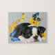 Adorable Boston Terrier plays in garden of colorful flowers when large bumble bee lands on his nose. This is a Ooak Friskybizpet Design and is available on apparel, household and office items, posters, greeting cards, and many more fun merchandise for fans of the Boston Terrier Dog.