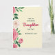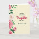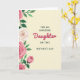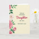This card features a Mother’s Day message framed by delicate flowers, set on a soft cream background that feels gentle and affectionate ❤️. Centered near the top, dark sans-serif text reads “FOR AN AMAZING,” with matching text near the bottom reading “ON THIS MOTHER’S DAY,” creating a neat frame around the main word. In the middle, the word “Daughter” appears in flowing fuchsia lettering, drawing the eye like a loving note meant to be lingered over. Along the left edge, a vertical spray of rose-like blooms in soft pink shades leans inward, as if offering a quiet bouquet between close family. A single creamy white blossom sits among the pink flowers, adding a tender contrast that suggests care and closeness 🌼. Emerald green leaves and stems weave through the arrangement, giving the border a fresh, garden feel without crowding the message. The left-side floral cascade shows multiple full blooms and buds, with layered petals and rich green foliage against the calm cream space.