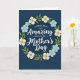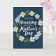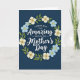 This greeting card features a loving Mother’s Day message centered inside a round wreath of flowers on a deep navy background. The main line reads “A special wish for an Amazing Niece on this Mother’s Day,” arranged in stacked lines so the eye moves gently from top to bottom, like a quiet conversation ❤️. “Amazing Niece” and “Mother’s Day” appear in flowing white lettering that feels soft and affectionate, while the smaller supporting words are also white in a simpler, easy-to-read style. Around the text, creamy ivory blooms with starburst-like brown centers alternate with sky-blue flowers touched with sunny yellow at their middles, adding a friendly, close-knit feel 🌼. Slender green stems and leafy sprigs weave together to complete the circular frame, suggesting closeness and steady care. The dark background makes the white text and pale petals stand out, with light shading that gives the design a gentle sense of depth. The wreath forms a neat ring around the message, with evenly spaced blossoms and small leaves filling the gaps against the navy field.