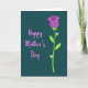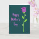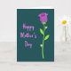 This card shows a deep teal background with a tall lime-green stem rising along the right side, like a gentle gesture reaching upward ❤️. Near the top, a large purple flower opens with smooth, simple linework and light shading that makes the petals feel softly shaped. A few small white buds dot the stem, adding a quiet, caring touch, as if the bloom is being lovingly watched as it grows. On the left side, the words “Happy Mother’s Day” appear in flowing pink lettering, angled slightly and sized large enough to balance the flower. The bright pink text stands out strongly against the dark teal, creating a friendly, affectionate contrast that feels like a warm note shared between close family or friends 🌼. Subtle shadows under the flower and buds add depth, giving the design a lifted look without making it feel busy. The purple blossom sits near the upper-right corner, with the white buds stepping upward beneath it and the pink message occupying the left-center area.