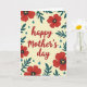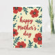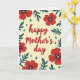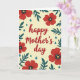 This greeting card features the words “Happy Mother’s Day” in flowing crimson lettering centered on a soft, creamy yellow background. The text sits like a loving note at the heart of the design ❤️, drawing your eye first before the surrounding details pull you in. Around the edges, five stylized flowers with red petals and dark centers touched with golden yellow create a cozy, garden-like frame, with a few blooms cropped as if they’re leaning in close. Deep teal-green leafy sprigs weave between the flowers, giving the layout a gentle, embracing feel, like a warm hug held a moment longer. Small teardrop shapes in calm teal-blue are scattered across the space, adding a light, confetti-like sparkle without crowding the message 🌼. The lettering stays centered while the floral elements balance the corners and sides, keeping the greeting easy to read. The overall look is softly illustrated with slightly textured edges and rich color, and the final detail is a cluster of teal-blue droplets sprinkled between the leaves near the top right.