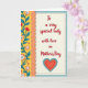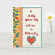 This greeting card features a tall layout split into two sections, with a decorative garden panel on the left and a calmer message area on the right that feels like a quiet note shared between close hearts ❤️. On the left, a golden-yellow background is filled with teal vines that curl and lean toward each other, dotted with small white blossoms, red tulip-like flowers, and red starburst accents that suggest an affectionate, lively exchange. A coral scalloped divider with tiny dotted texture separates the two sides, like a soft boundary between decoration and words. The right panel is warm cream, and near the upper center it shows a short message in flowing crimson lettering. Beneath the text sits a coral-red heart emblem, framed by an ornate teal ring with delicate curled detailing that adds a romantic, keepsake feel. Around the whole design, an inner border of small crimson dots sits inside a wider teal band edged with neat white dots, giving the card a tidy framed look 🌼. The left side glows in golden yellow with teal vines, white blossoms, red flowers, and red starbursts beside a coral scalloped divider, while the right side holds crimson text above a coral heart encircled by teal ornament, all wrapped in dotted crimson and white borders on teal.