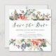 These elegant holiday wedding save the date cards feature rustic watercolor flowers with pinecones, branches, berries, leaves, and white roses and lovely calligraphy.