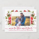 Photo Christmas Pregnancy Announcement Cards. Expecting parents! Modern red hand lettered typography script "the More the Merrier!" card to share your happy news with family and friends in the holiday season. Features watercolor red winter botanical floral, pine branches, red berries and holly with foliage arrangement. At the backing dusty sage green and white snowfall graphic design. Personalize by replacing the text template and the horizontal photo. If you need help or matching items, please contact to me!