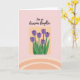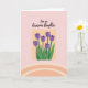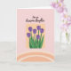 This card features a softly colored digital illustration with a blush pink background that feels gentle and affectionate ❤️. In the center, a rounded rectangle holds a small garden-like cluster of stylized plants, suggesting closeness and care through their tight, gathered arrangement. Six deep purple flower heads rise on slim green stems, surrounded by leafy green shapes, all set against a warm yellow-orange field that looks like a quiet glow. Above the flowers, the message “For an Awesome Daughter” sits near the top in dark brown flowing lettering that stands out clearly against the pale background. The careful spacing gives the words room to breathe, like a calm pause before the floral scene below. Along the bottom, wide curved bands in peach and creamy off-white sweep across the card, adding a cozy, supportive feel like a gentle arm around the design 🌼. The central panel’s edges are softly rounded, and the lower bands form smooth, layered waves in peach and cream.