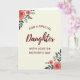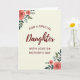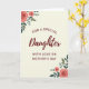 Designed with a soft ivory background, the card centers a gentle message that feels like a close hug between family members ❤️. Muted coral and dusty rose flowers sit in opposite corners, as if leaning toward each other like old friends sharing a quiet moment. Dusty emerald leaves curl around the blooms, with a few muted teal-blue florets tucked in to add a calm, fresh touch 🌼. The main wording is placed in the middle, with most lines in a simple sans-serif style colored deep maroon. One key word, “Daughter,” appears in a flowing, calligraphy-like style that stands out as the most affectionate focal point. The botanical pieces angle diagonally across the card, subtly guiding the eye from one corner toward the text and then to the other corner. The border-like greenery frames the center without crowding it, leaving plenty of open space for the message to breathe. In the top-left and bottom-right corners, the clustered blossoms are softly shaded in coral and rose with deep green leaves and small teal accents.