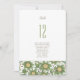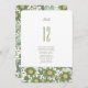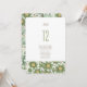 This table number card is a harmonious blend of natural beauty and classic design. Featuring a rich botanical print with full blooms and lush foliage in shades of sage, olive, and avocado green set against a crisp linen white background, it brings a touch of nature's splendor to your event's tablescape. The prominent table number is displayed in a large, elegant font in a coordinating shade of green, providing clear guidance for guests. Names are neatly listed in a refined typeface, adding a personal and sophisticated detail. This card is perfect for weddings, banquets, or any event where the beauty of nature and the elegance of design are celebrated.
