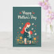 Designed with an intimate vertical illustration, the card centers on an adult woman and a young child wrapped in a close embrace, their matching reddish-orange hair linking them like family. The woman wears a dark teal dress dotted with small white flowers, tilting her head down with closed eyes while the child looks up with a tender, trusting gaze ❤️. Behind them, a deep teal background feels calm and roomy, sprinkled with small floating shapes that suggest leaves, petals, and airy wing-like forms. Warm red leaf accents and yellow-orange blossoms drift around the pair, adding a gentle sense of celebration without crowding the scene 🌼. Along the lower area, larger stylized plants rise up with orange round blooms and thin green stems, framing the hug like a garden border. Near the top, a short Mother’s Day message sits centered in white, with a few tiny decorative marks around the letters. Fine outlines and flat areas of color keep the figures clear and modern, with crisp white details standing out against the teal field. Small white wing-like shapes and scattered red leaves hover around the couple on the deep teal background.