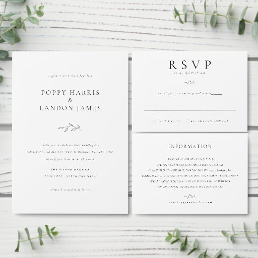 Simple elegance wedding information enclosure card features classic Black on White typography with an ash leaf branch - botanical line art.