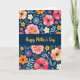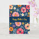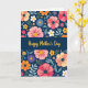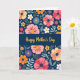 This greeting card features a deep navy background filled with stylized flowers and leafy sprigs that feel like a gentle bouquet offered with care ❤️. A wide horizontal band runs across the middle in the same dark blue, creating a calm space that draws the eye. Centered on that band, the words “Happy Mother’s Day” appear in glowing golden lettering, standing out clearly against the dark field. Above and below the band, blossoms in coral pink, magenta, sunny yellow, soft white, orange, sky blue, and deep purple cluster together like close friends leaning in for a photo. Many petals are simple and rounded, while the flower centers add intimacy through tiny dots and darker speckled details, like little notes tucked into the design. Cool green and bluish leaves weave between blooms, softening the straight divide and giving the layout a cozy, embracing flow 🌼. The top and bottom edges are densely framed with florals, and the gold message sits neatly centered in the middle strip.