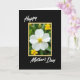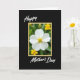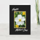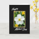 This card features a single white flower with six gently opened petals centered inside a thin yellow frame, like a small window into a garden moment. At the flower’s core, a tight cluster of golden-yellow stamens glows, giving the bloom a tender, affectionate warmth ❤️. Behind it, the background fades into soft green with a few out-of-focus yellow blossoms, creating a calm setting that feels like a quiet walk together. The main flower stays sharply detailed while everything else blurs back, drawing your eye in the way two close friends lean toward each other in a photo. The word “Happy” appears above the framed image in white flowing lettering, and “Mother’s Day” sits below in the same white style. All of this rests on a deep black background that makes the whites look brighter and the yellows feel sunnier 🌼. The yellow border is slim and even, outlining the flower scene with a neat rectangle against the black.