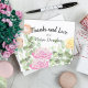 Send a special thank you card with a creamsicle, peach, pink, and yellow botanical design. This garden rose thank-you card is super charming with matching invitations, envelopes, and party decor. Watercolor roses are adorned with a spray of silver Dollar eucalyptus leaves. These watercolor floral thank you cards are easily customized after your graduation party, birthday party, or wedding.