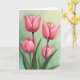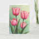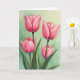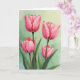 This card features four cup-shaped blossoms in rich fuchsia, their petals opening at different stages like close friends leaning in for a quiet chat ❤️. Two fuller blooms sit higher on the design with ruffled edges, while two smaller buds rest below, suggesting a gentle, growing connection. The color shifts from intense pink at the centers to softer rose along the outer edges, with careful shading that makes each fold look velvety. Deep brown stems rise in slim lines, and wide green leaves gather near the bottom as if cradling the flowers together. Behind them, a pale mint and sage wash creates a calm, airy setting, like a soft spring morning 🌼. A short greeting appears near the top in a simple dark tone, leaving the artwork to carry most of the mood. The letters are spaced neatly and kept small so they don’t compete with the blooms. The background stays lightly mottled in green, with the brightest highlights catching along the petal rims and the deepest tones pooling in each blossom’s center.