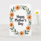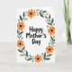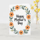 This greeting card features the message “Happy Mother’s Day” in large, friendly black lettering centered on a white background. The words sit inside an oval wreath of flowers and leaves that feels like a gentle hug around the message ❤️. Orange and yellow blooms with dark centers lean toward one another as if sharing a quiet, affectionate moment. Deep green leaves and lighter olive sprigs weave between the petals, adding a soft, garden-like setting. Small powder-blue accents and tiny pale-yellow starburst flowers dot the border, like little nods of friendship 🌼. A few muted blue-gray circles are scattered around the wreath, adding extra texture near the edges. The black text stays neatly in the middle while the colorful garland wraps evenly around it, with the brightest blossoms clustered near the top-left and bottom-right of the oval.