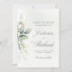 Beautiful Save the date card featuring watercolor eucalyptus and gold leaves.