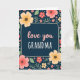 Designed with a rich botanical border, this card centers a deep midnight-blue rectangle that feels like a cozy window into affection ❤️. Inside the panel, the words “love you” appear in soft coral pink, written in flowing lettering near the top, with “GRANDMA” set below in white uppercase text. A thin cream outline frames the text area, giving it a gentle, cared-for look, like a quiet hug held in place. Around the frame, large open flowers in salmon pink and butter yellow lean inward as if gathering close, their dotted centers adding a tender, intimate texture. Smaller blooms and sprigs fill the corners with light green leaves, creating the sense of a friendly garden surrounding the message. Tiny light-blue dots scattered across the dark background read like little dew drops, adding a soft sparkle 🌼. The border stays full and balanced, with petals and leaves wrapping all four sides while the center remains calm and clear in deep blue.