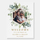 This wedding welcome sign (foam board) features painted watercolor eucalyptus, green leaves, and a photo with a faux gold hexagon frame. For more advanced customization of this design, please click the "Customize further" link. Matching items are also available.