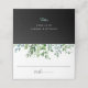 Modern botanical greenery border, wedding place cards. Inside of card and back features solid black color.