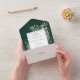 All in one wedding invitation featuring elegant botanical watercolor greenery leaves on an emerald green background and a chic gold frame border. The invitation includes a perforated RSVP card that’s can be individually addressed or left blank for you to handwrite your guest's address details. Designed by Thisisnotme©