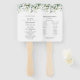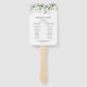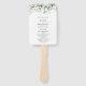 Customizable wedding program fan, featuring forest green botanical leaves on a white background.