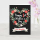 This card features a deep black background with a heart-shaped wreath of leafy greenery and small flowers, creating a cozy frame that feels like a gentle hug ❤️. Coral, blush pink, and rich red blooms are scattered through the leaves, giving the heart a romantic, celebratory look without feeling busy. Centered inside the floral heart, the words “Happy 1st Mother’s Day” appear in white, with “1st” set in bright red so it catches your eye right away. Near the bottom of the heart, a small white bird with a soft beige accent sits calmly, adding a sweet, caring touch like a quiet companion. Beneath the heart, a cream-colored ribbon banner stretches across the lower area, suggesting a note being offered with affection. On the banner, “Dear Daughter” is written in warm red lettering, keeping the message close and intimate 🌼. The flowers have a lightly painted texture that softens the contrast against the dark background. The final detail is the little bird perched at the base of the heart, facing slightly upward toward the centered text.