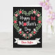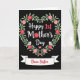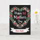 The front design shows a heart-shaped wreath of flowers and leafy greenery glowing against a deep, velvety black background. In the center, a celebratory message sits in white lettering with coral touches, drawing your eye inward like a quiet embrace ❤️. The wreath is filled with blossoms in rosy pinks and rich crimsons, with soft green leaves that look lightly painted for a tender, romantic feel. Two tiny grey birds with small orange beaks perch on the lower curves of the heart, facing inward as if sharing a gentle moment. A small pink heart is tucked among the flowers, adding a sweet detail without crowding the design 🌼. Beneath the wreath, a white ribbon banner stretches across the bottom with a closing line written in flowing red lettering. The flowers curl around the heart shape with layered petals and scattered leaves, and the birds sit neatly at the lower left and lower right edges.