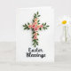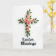 Designed with a top-down view, the scene shows a cross-shaped arrangement of fresh botanicals resting on a bright white background. Deep green leaves form the main outline, and their tidy edges give the shape a calm, steady presence. Nestled among the greenery are roses in blush pink, warm coral, and soft peach, their petals opening like a gentle exchange between close friends. Small white buds are scattered throughout, adding tiny points of light like quiet little promises 🌷. Soft, even lighting brings out the textures of the leaves and petals, with faint shadows that sit close to the stems and keep the layout airy. Near the bottom of the card, a flowing line of text appears in a dark gray tone, centered and spaced well below the floral shape, like a note left with care 🐰. The white background stays unadorned, and the cross of greenery and roses remains the clear focal point with pale petals and tiny white buds standing out against the blank space.