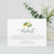 Add the perfect finishing touch to your wedding suite with this customizable details card, featuring a beautiful watercolor design of lemons, blossoms, and greenery. This card is ideal for sharing important event information, such as accommodations, directions, or your wedding website, with your guests. The vibrant watercolor elements bring a refreshing, natural charm to your celebration, making it perfect for a garden, rustic, or nature-inspired wedding. Personalize the details card with your unique event information to ensure your guests have everything they need for your big day. Whether paired with your invitations or as a stand-alone piece, this details card is both functional and stylish, offering a cohesive look for your wedding stationery.