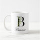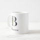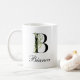 Personalize your morning coffee with this elegant botanical monogram mug. Featuring a classic black serif letter B intertwined with soft watercolor eucalyptus greenery. Easily customize it with your name in a stylish script. A perfect, thoughtful gift for birthdays, bridesmaids, or office coworkers who love minimalist nature-inspired design.