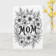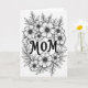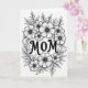This card features a monochrome floral illustration centered on the word “MOM” in thick, flowing lettering that feels like a gentle embrace ❤️. Around it, an almost circular wreath of open-petaled flowers and slender leafy sprigs leans inward, like a close circle of friends gathering near. The blossoms resemble simple daisies, with many narrow petals radiating from softly dotted centers, creating a tender, caring look in the details. Leaves and stems weave between larger and smaller blooms, giving the arrangement an easy, natural movement that suggests warmth without needing extra color 🌼. The background stays bright white, while crisp black outlines keep every petal and leaf clear and calm to the eye. The text sits in the middle of the wreath, and its dark lettering stands out strongly against the pale space around it. A faint shadow under parts of the wreath makes the flowers and foliage appear slightly raised from the page.