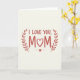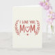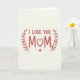 This greeting card features the centered words “I LOVE YOU, MOM” on a creamy off-white background that feels soft and inviting. “I LOVE YOU” sits on the top line in a simple, friendly letter style, while “MOM” appears larger beneath it, drawing the eye like a warm hug. A small white heart replaces the “O” in “MOM,” adding a quiet romantic touch ❤️ without needing extra decoration. Two thin botanical branches in muted red curve in from the left and right, their leaves angled inward as if gently embracing the message. Beneath the main words, a fine horizontal line stretches across the card, keeping the layout balanced and calm. At the center of that line is a tiny textured heart that looks lightly dusted, giving a subtle sparkle 🌼. The overall design stays uncluttered, with plenty of open space around the lettering and the red branches framing the text. The muted red leaves arc upward on both sides, forming a loose wreath around the white heart in the middle of “MOM.”