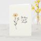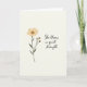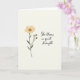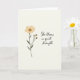 On the front of the card a softly textured, warm off-white background sets a calm, intimate scene that feels like a quiet note between close friends ❤️. On the left, a detailed botanical drawing shows one open flower at the top, with rounded petals in a creamy, pale yellow and a dotted ochre center. A slender olive-green stem runs downward, framed by deep green leaves that lean gently as if reaching toward someone nearby. Just below the main bloom, three small buds in the same soft yellow sit close together, adding a tender, caring energy to the arrangement. On the right side, the phrase “She blooms in quiet strength” appears in charcoal-gray lettering, placed with generous space around it so the words feel unhurried. The text sits roughly centered vertically, balancing the flower on the opposite side, and the overall layout keeps the focus on the gentle connection between growth and affection 🌼. The illustration uses muted, natural tones with smooth shading and no harsh outlines, and the buds cluster just beneath the blossom while the leaves angle outward from the stem.