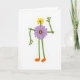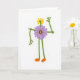 This design shows an anthropomorphic flower figure built from simplified botanical shapes, standing centered on a plain white background with a gentle, friendly presence ❤️. Its body is a purple, many-petaled bloom with a yellow core and a deeper violet ring, like it’s wearing a soft floral jacket. Thin green stems form the arms and legs, ending in small orange feet and rounded bud-like hands that feel inviting rather than sharp. The head is a yellow, star-shaped flower with a green center, tilted slightly as if meeting your gaze with quiet affection 🌼. Soft, even lighting keeps the colors flat and smooth, letting the greens, yellows, purples, and oranges sit side by side in a calm, romantic harmony. Any text would sit neatly along the top in a simple dark tone, with a smaller line near the bottom in a matching color to balance the space. The right arm is raised with three rounded bud “fingers,” like a gentle wave held midair against the white space.
