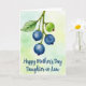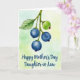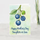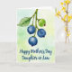 Designed with soft watercolor washes, the card features a slender branch dropping in from the upper left, like it’s leaning in close to share a quiet moment ❤️. A single serrated leaf clings to the stem, its veins lightly traced as if holding on with gentle devotion. Near the middle hangs a cluster of four round berries, three painted a deep blue with tiny star-shaped details at their bases that feel like small, affectionate accents. One berry sits slightly higher and looks younger, tinted pale green with faint yellow speckles and a tiny red mark that adds a shy, budding note to the scene. Behind everything, the background fades through misty greens with soft touches of yellow, suggesting a calm, sun-dappled garden air. Along the lower portion, a short message appears in flowing dark ink, centered and easy to spot against the light wash 🌼. The berries show smooth shading while the leaf edges and veins are delicately defined, and the branch angles down toward the words at the bottom left.