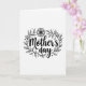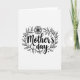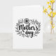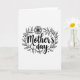 This card features a black-and-white illustration centered on the words “Mother’s Day” in flowing, decorative lettering that feels like a gentle embrace ❤️. The text sits prominently in the middle, with thick and thin strokes that give it a soft, affectionate rhythm. Surrounding the phrase is an oval wreath made of slender branches and many small pointed leaves, forming a close, protective frame like a caring hug. A single multi-petaled flower rests at the top of the wreath, simple in shape but placed like a tender crown 🌼. Tiny dots and small star-like marks are sprinkled around the outer edge, adding a light, celebratory sparkle without crowding the design. The background is plain white, letting the crisp black lines of the leaves, flower, and lettering stand out clearly. The “Mother’s Day” text appears in black at the center, with the botanical outlines evenly spaced around it in matching black ink. At the top of the oval wreath, the flower’s layered petals are outlined in black with a small dark center.