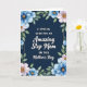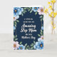 Designed with a deep navy-blue background, this Mother’s Day card feels calm and close, like a quiet moment shared between family ❤️. Centered on the front is a white message that reads “An Amazing Step Mom on this Mother’s Day,” mixing a neat serif style with a flowing cursive style for a gentle, affectionate look. The words sit slightly raised, giving them a soft, dimensional presence against the dark field. Around the edges, a watercolor-like frame of botanicals wraps the message in a caring embrace, with soft blue and pale pink flowers tucked among fresh green leaves 🌼. The larger blossoms have textured golden centers that catch the light like tiny sparks, adding warmth without overpowering the cool tones. A thin copper-toned line traces the inner edge of the floral border, subtly guiding your eye back to the centered text. The flowers cluster most densely at the corners, with airy petals and leaves stretching along the sides to form a balanced frame. The final look shows translucent petals, green foliage, golden flower centers, and a fine copper outline surrounding the white lettering on the navy background.