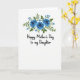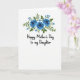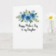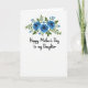 The front design shows a bright white background topped with a centered floral cluster that feels like a gentle bouquet offered with affection ❤️. Three deep blue, rose-like blooms sit near the top center, their softly shaded petals giving a tender, romantic softness without needing any extra flourish. Around them, layered green leaves curl in different directions, as if they’re leaning in together like close family members sharing a quiet moment. Small sky-blue flowers are sprinkled between the leaves, adding a light, friendly touch like little notes of encouragement 🌼. Beneath the flowers, the message “Happy Mother’s Day to my Daughter” is set in flowing black lettering, centered and easy to read. The dark text stands out strongly against the white space, leaving plenty of breathing room between the bouquet and the words. The blues and greens stay mostly in the upper half, while the lower half remains open and airy around the centered line of text. Tiny sky-blue florets dot the greenery just above the black message line.