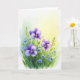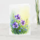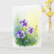 Designed with a soft watercolor look, the card shows a lush cluster of five-petaled purple flowers with tiny sky-blue blooms tucked between them, like close friends leaning in ❤️. Deep green leaves and slender stems gather along the bottom edge and rise upward, giving the bouquet a gentle, reaching motion. Each flower has a sunny yellow center that draws your eye like a warm glance shared across a room. The background fades from a glowing yellow area near the upper right into pale aquamarine and then into white toward the outer edges, keeping the scene light and airy. Subtle shifts in the purple petals—from deep violet to light lavender—add a tender, romantic softness without needing any characters at all. There is no lettering over the flowers, leaving open space above the bouquet where a short message could sit in a small, dark gray font if desired 🌼. The brightest yellow tones appear in the flower centers and the upper-right corner, while the edges stay softly washed in white.