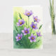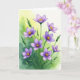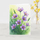 This design shows a watercolor-style bouquet of purple flowers rising on slender green stems, arranged so the blossoms seem to lean toward one another like close friends sharing a quiet moment ❤️. Each open bloom has five soft lavender petals circling a detailed yellow-gold center, with gentle shifts of light that suggest a velvety surface. A few flowers tilt sideways or sit partly behind others, creating depth and a natural, lived-in look. Between them, slim green buds point upward, adding contrast with their sharper shapes and a sense of new growth 🌼. The background fades from a sunny yellow near the top into richer greens toward the bottom, like light drifting down through a garden. There is no character figure, but the clustered blossoms and their tender, inward angles give the scene a romantic closeness. Any greeting text would sit neatly near the upper area in a soft, dark tone that stays readable over the pale yellow wash. The top edge glows warm yellow while the base settles into layered green washes behind the stems.