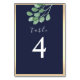 This table number design combines rustic elegance with a modern twist. Featuring watercolor eucalyptus greenery in lush, soothing tones, and accented with sophisticated gold and navy blue hues, it exudes a timeless charm. The simple calligraphy script adds a touch of grace, making it a perfect fit for a chic, botanical-inspired wedding.