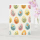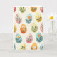 Designed with a repeating field of egg-like shapes, this card sets a gentle spring scene on a soft creamy background 🌷. Each oval is tinted in calm pastels—sky blue, warm yellow, blush pink, and muted coral—so the pattern feels friendly and inviting. The paint look is softly textured with slight shifts in tone, like careful brushwork that makes every shape feel a little different. Inside the ovals, leafy sprigs and flowers curl and reach toward one another, creating little moments that read like quiet companionship. You’ll spot deep green stems, an orange tulip-like bud, and an open white star-shaped bloom with a tiny pink center, arranged so the florals seem to lean in close 🐰. A short greeting sits near the top in a light, springy color, with smaller words centered beneath it in a softer shade for balance. Across the design, the ovals are evenly spaced, with floral details layered neatly within each pastel shape.