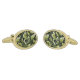 Cufflinks shown in a gold-plated finish in an oval shape with a lovely green tone botanical print.