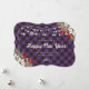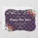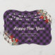 Elegant purple buffalo plaid New Year card featuring a watercolor painting of poinsettia, holly and red berries along with string lights on a purple and black buffalo plaid background. Easily personalize online.