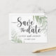Simple and elegant save the date postcard. Featuring a minimalist, hand written style calligraphy and tropical foliage in green. Easy to customize with your unique information.