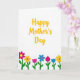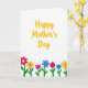 This card features the words “Happy Mother’s Day” in golden-yellow lettering that stretches across the upper two-thirds of a bright white background, with the message centered and easy to read. The letters curl in smooth, flowing strokes that feel like a warm embrace, as if spoken with a gentle smile ❤️. Below the text, a row of stylized flowers forms a decorative border along the bottom edge, like a small garden arranged for someone special. The blooms mix fuchsia pink, sunny yellow, and soft blue, and their varied shapes suggest everything from rounded five-petal blossoms to tulip-like buds, creating a friendly, caring mood. Simple green stems and small leaves line up beneath them, giving the scene a tidy, grounded look that still feels affectionate and close. The wide white space around the message keeps the focus on the greeting and the flowers, like a quiet moment set aside just for her 🌼. Along the bottom margin, the flowers sit in a neat horizontal band with bright green stems and alternating pink, yellow, and blue petals.