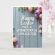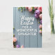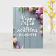 Designed with a soft, seasonal greeting in mind, this card centers on large white lettering that shares an Easter message and a loving dedication, set against softly painted wooden planks with a gentle grain. The main text sits in the middle, with a smaller line tucked just beneath it, both in white so they stand out clearly. A faint shadow under the letters gives them a lifted look, as if they’re hovering slightly above the background. Around the edges, delicate flowers and buds curl in from the upper right and lower left, like a quiet embrace that hints at closeness between two people. The blossoms lean toward blush pink and muted lavender, while fresh green stems and leaves guide your eyes back to the words 🌷. Soft, diffused light keeps everything calm and tender, with no harsh contrasts, just an easy, affectionate mood. In the corners, the petals are lightly shaded and the greenery arcs inward in a loose frame 🐇.