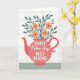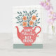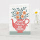 Designed with a coral-red teapot at the center, the rounded shape is dotted with small white spots that give it a cozy, friendly look ❤️. From the open top, leafy branches rise upward in soft teal-green, leaning toward each other like a gentle embrace between close friends. Tucked among the leaves are five orange flowers with simple petals and dark centers, adding bright little sparks of affection across the bouquet 🌼. A short message is placed right across the front of the teapot in white cursive-style lettering, standing out clearly against the warm red. Behind the illustration, an off-white background with a faint light-gray grid hints at a tidy kitchen wall without pulling focus from the main image. Along the bottom edge, a muted teal band runs horizontally, grounding the teapot as if it’s resting on a counter. The teapot’s handle curves on one side while the spout points outward, with the flowers spreading above in an airy fan.