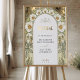 This elegant wedding welcome sign features a stunning botanical design with magnolia blossoms and intricate floral detailing in soft green and gold tones. Framed by an ornate arch, the artwork showcases delicate gold accents, offering a vintage yet modern aesthetic. The cream-colored background enhances the floral arrangement, giving the sign a clean, sophisticated feel. Perfect for a garden, bohemian, or rustic wedding, this sign warmly greets guests with a refined, nature-inspired touch. The blend of delicate florals and gold details creates a timeless piece that complements a variety of wedding themes and venues.