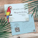 This design features a cute wild birds animal party, a tropical beach pool outdoor party, a colorful jungle parrot wildlife cute, a simple minimalist minimal modern, a stylish trendy calligraphy script, a botanical palm tree leaves leaf, with tropical green greenery foliage, a whimsical cute fun party invitations, a simple fun summer birthday party, a botanical jungle paradise island a budget-friendly postcard